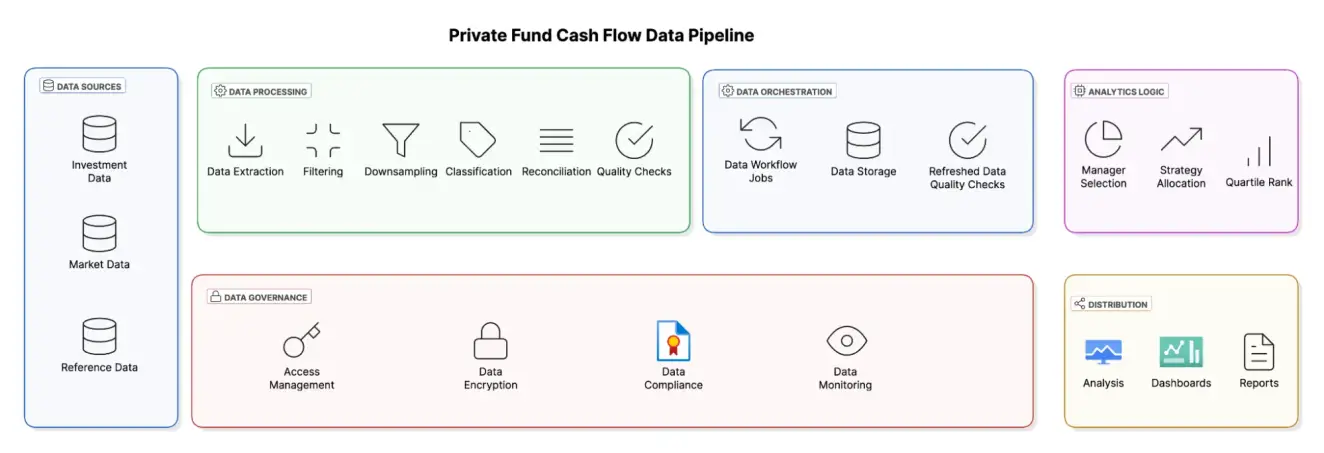 Aggregation of all relevant private fund investment data through various means, including the Alts Data Management solution, fund admin data feeds, fund platform integrations and manual client data entries. Once this data is gathered from across these different sources, we have a series of hard and soft filters that decompose this enormous dataset into millions of relevant cash flow transactions.