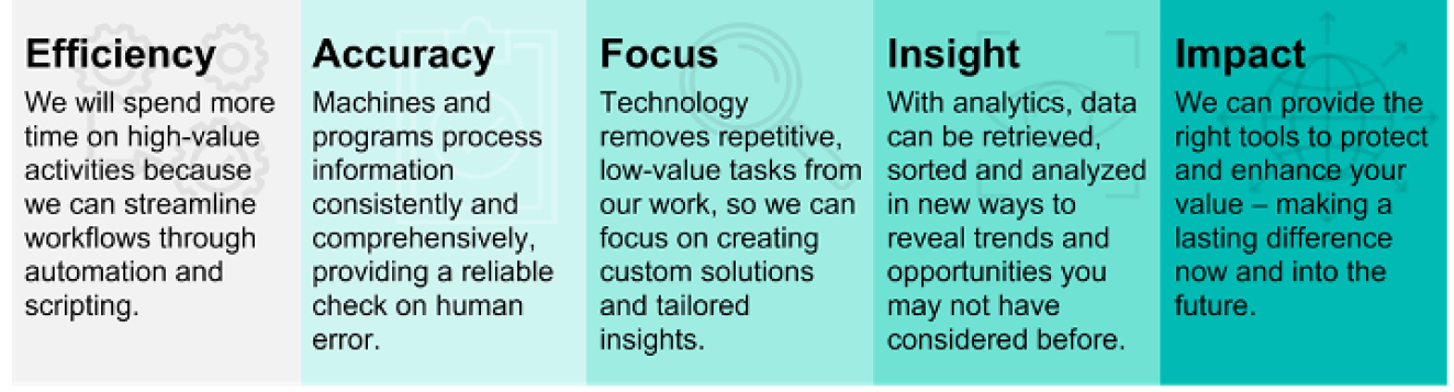I think a key factor in our success has been our ability to quickly adapt to new innovations and adjust to changing regulatory requirements. Our investment in technology is an investment in helping our clients do both – adapt to new technology and to changing regulations. I’ll share a graphic with you that illustrates how our investment in technology directly translates to this improved client experience.