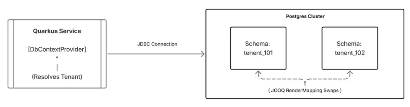 The real power comes from the RenderMapping. Developers write queries against a static default schema, usually public. At runtime, right before execution, JOOQ swaps the schema name for the correct tenant_101.