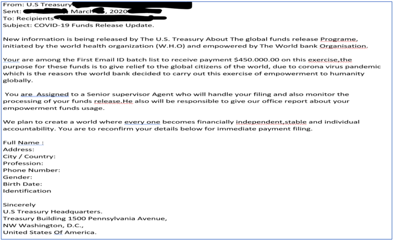 You can find real-world examples on websites like the Cybersecurity and Infrastructure Security Agency (CISA) and the Internet Crime Complaint Center. Start by educating yourself about what to watch for and then consider sharing that information with your networks. The key takeaway is simple: No one is giving away free money and no one has developed a Coronavirus vaccine. If it sounds too good to be true, then it probably is.