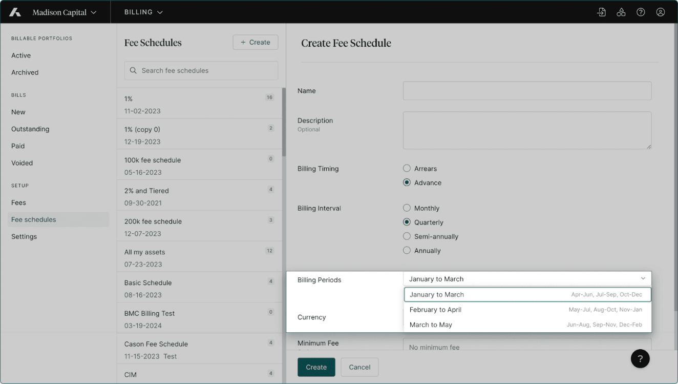 Addepar now allows you to run quarterly and semi-annual bills using your firm’s preferred month-end date. For example, you can run bills for a client with quarter-end dates in January, April, July and October, rather than in March, June, September and December.