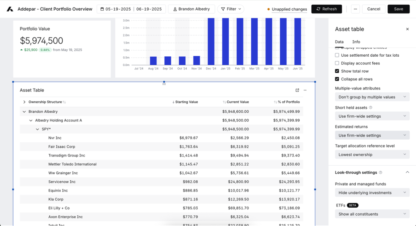 Addepar clients can review the release notes for details on our latest product updates. Not a client? Contact our team at bd@addepar.com for more information.