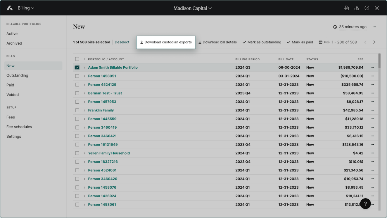Addepar’s latest billing updates make managing fees more efficient and precise. Users can now download billing data directly in custodian-compatible formats for Pershing and Schwab, eliminating the need for manual formatting. This saves time, reduces the risk of errors and accelerates communication with custodians — enabling faster fee collection. Additionally, downloaded bills now include proration details (except in custodian-formatted files), providing the advanced calculation insights needed for deeper analysis.