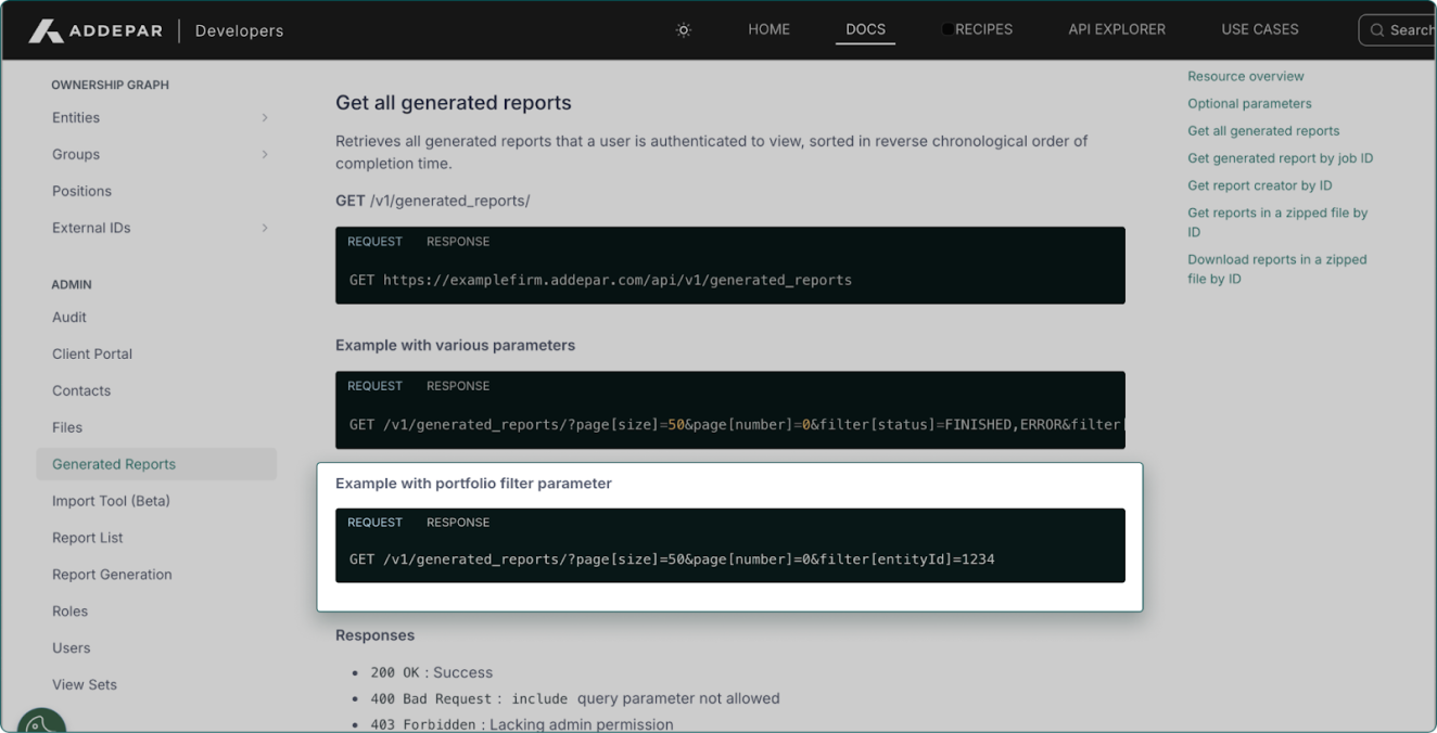 Specify which portfolio you want to see generated reports for with the Generated Reports API