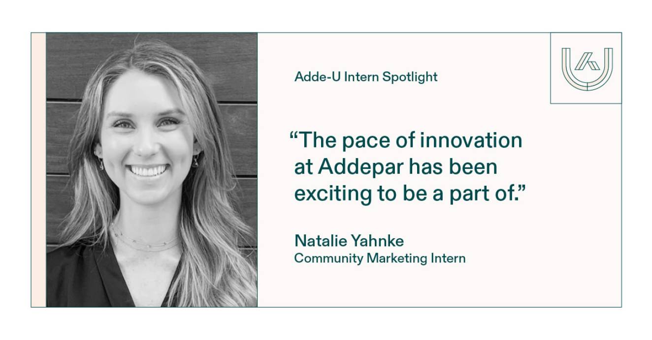 “A huge takeaway from Addepar has been self-development, self-improvement and self-learning, both professionally and educationally. Once, my manager reached out to me about an area I was interested in and proactively reached out to a different team to see if there were any opportunities for cross-collaboration. I really appreciated that she prioritized my interests and growth.” - Natalie Yahnke