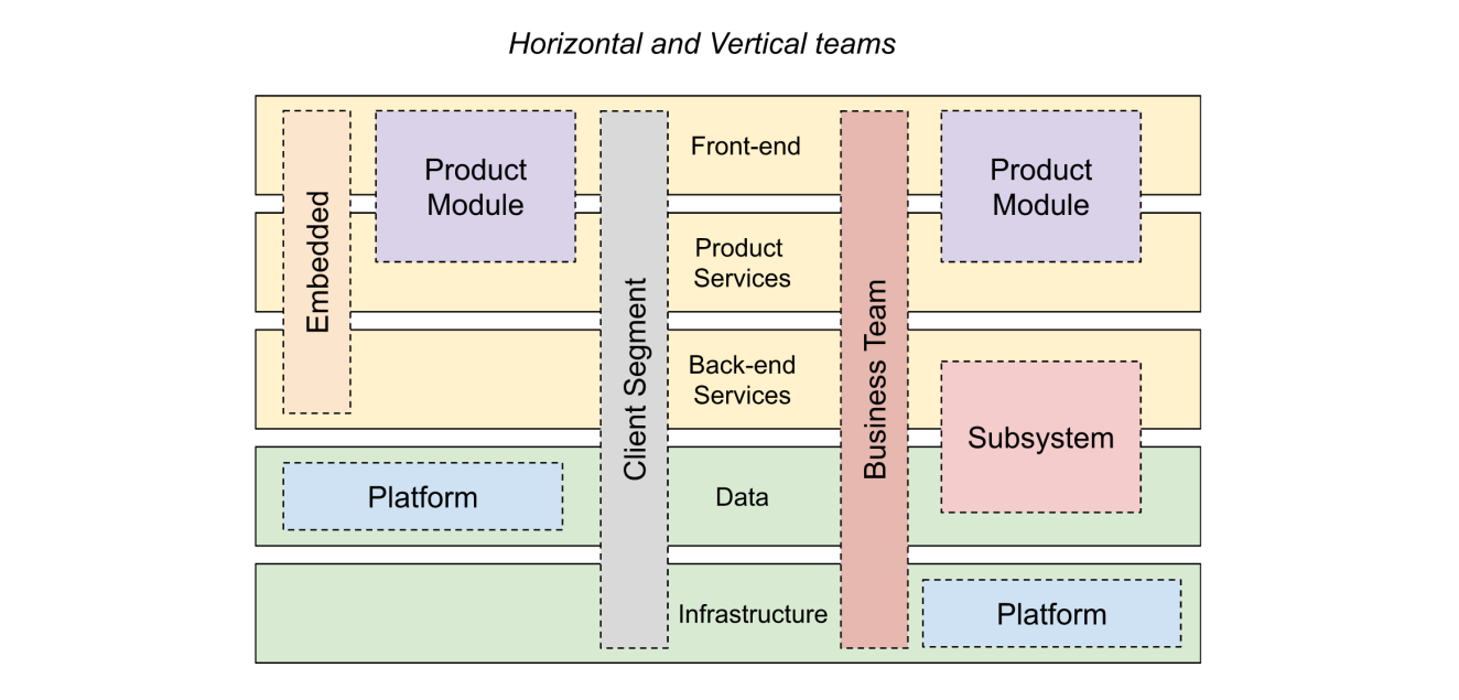 Most teams quickly outgrow the technology-split model as the natural cut point resulting from team growth creates more teams of the same type, e.g., multiple back-end teams, multiple front-end teams all with the same mandate. This requires increased communication and coordination which decreases productivity. The preferred model most companies adopt is a combination of vertical and horizontal teams which take a few different forms: