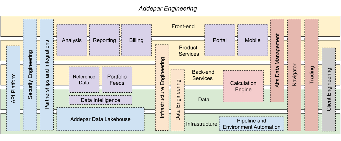 Addepar is on the same journey as other high-growth, high-performing SaaS companies. Four years ago, the engineering organization looked similar to a technology split team structure. Today, the organization is much larger and much more complex. It is a mix of every single type of team across the entire technology stack. This is the result of several reorganizations aimed at aligning mandates and creating independence between teams. As we’ve launched newer products, including Alts Data Management (ADM), Navigator and Trading, those teams have been created as separate business teams which are responsible for all facets of the respective product life cycle. There is currently one client segment team in engineering that focuses on the largest clients including enterprises and institutions. Addepar also has a number of platform teams, like the Data Lakehouse and API Platform, that provide an internal product to most other teams.