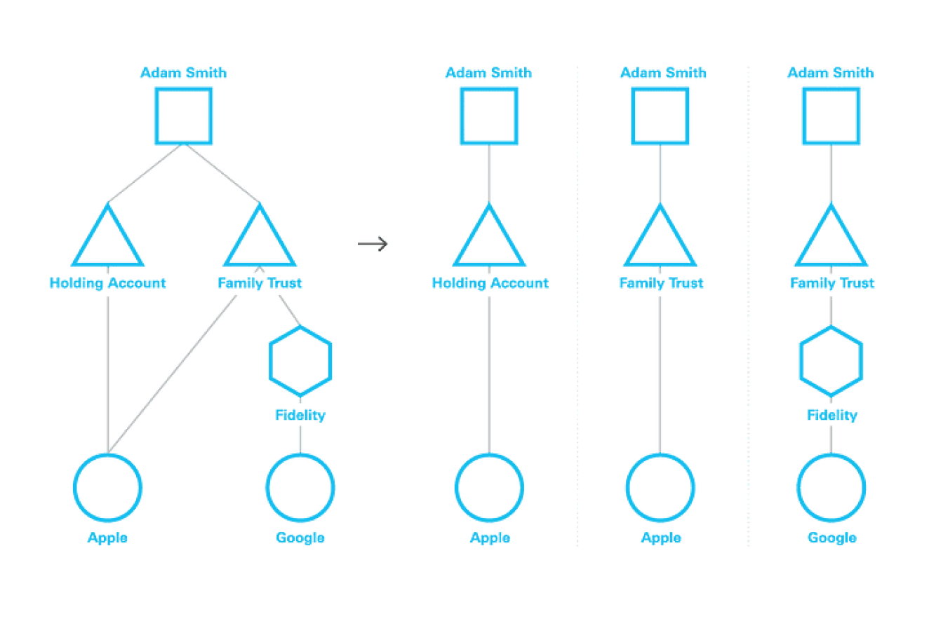 Graph Walk - Traverse the financial graph associated with the selected portfolio and generate all unique ownership paths in the graph (see Figure 1). These paths reflect each position in the portfolio and its ownership information, and are equivalent to rows in the SQL analogy.