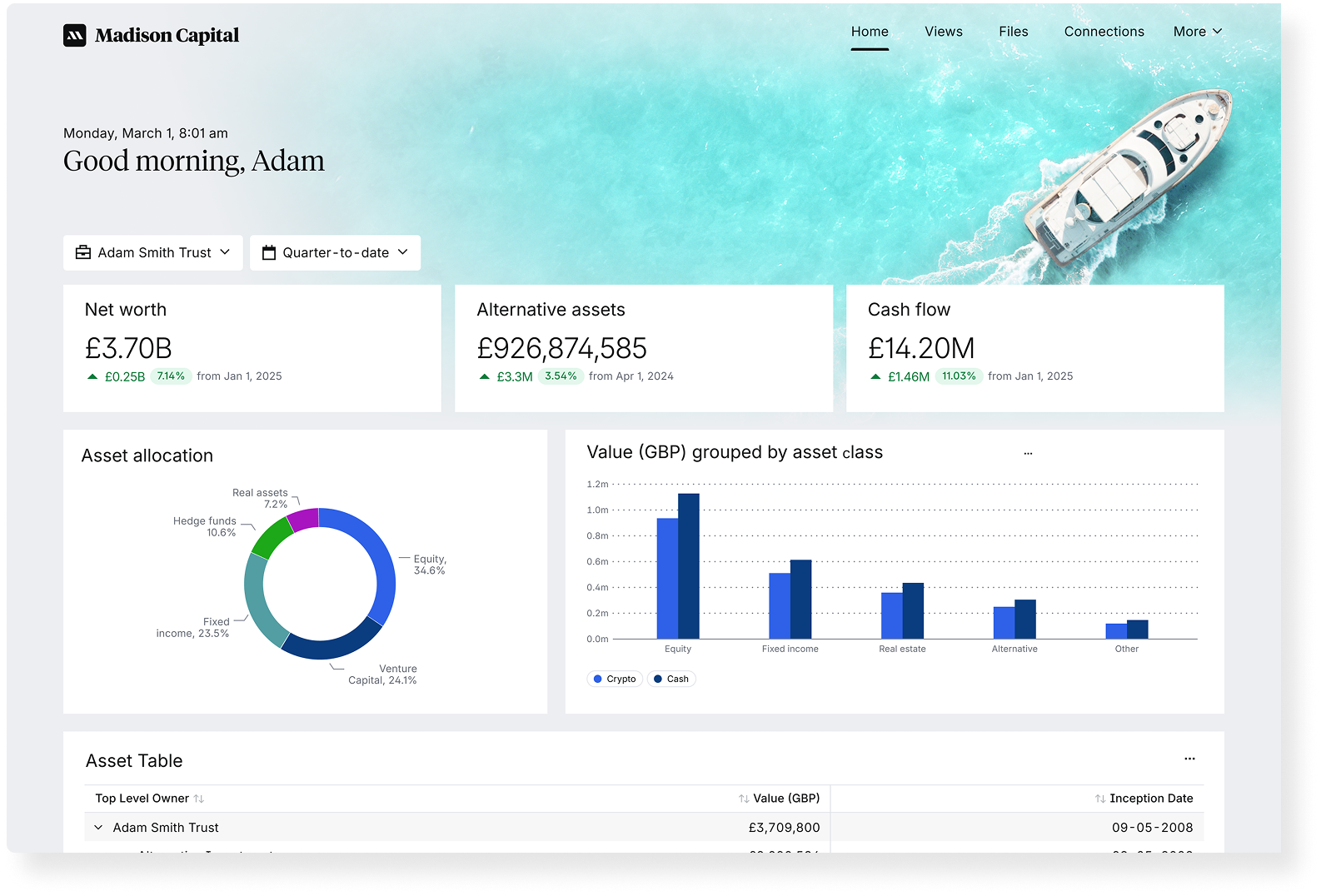 Automate data aggregation and leverage our best-in-class verification process to enhance data quality. Benefit from Addepar’s integrated data feeds and see every asset, all in one place.